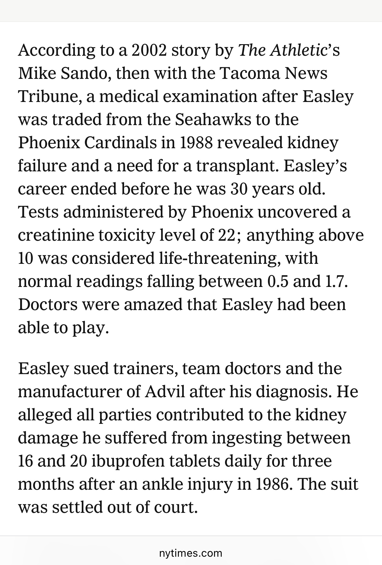 Kenny Easley, Hall of Fame defensive back in the NFL passed away yesterday at the age of 66. He had to retire retire early because team doctors were giving him an absurd amount of nonsteroidal inflammatory drugs, which caused him to go into kidney failure and retire before the age of 30. Check out this excerpt of a New York Times article based on a piece written in a journal back in 2002. It’s important for athletes at all levels to have their own physicians and healthcare professionals so that they can act independently in the best interests of the athlete.